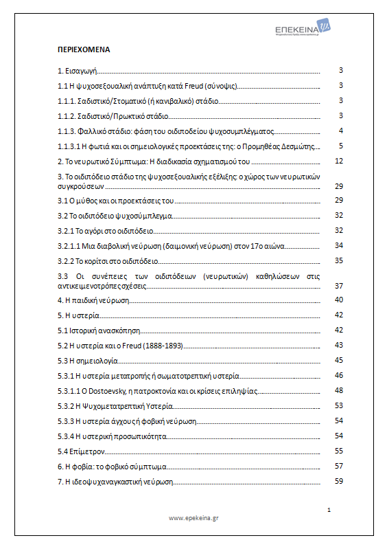 Γίνεται μια διεξοδική “ανατομία” του κλινικού φαινομένου των νευρώσεων, της σημειολογίας τους και των φάσεων της ψυχοσεξουαλικής εξέλιξης επί των οποίων εγκαθίστανται οι σχετικές καθηλώσεις της λιβιδούς. Πιο συγκεκριμένα προτείνεται μια εκτενής εμβάθυνση της διαδικασίας σχηματισμού του νευρωσικού συμπτώματος στις αμυντικές ψυχονευρώσεις (φοβική νεύρωση, υστερία μετατροπής, ιδεοψυχαναγκαστική νεύρωση) στις οποίες προεξάρχει η αμυντική διεργασία της απώθησης. Σε αυτές τις περιπτώσεις το νευρωσικό σύμπτωμα αναπαριστά και συμπυκνώνει συμβολικά τη συμβιβαστική λύση ανάμεσα στην απαγορευμένη επιθυμία (αιμομικτική-επιθετική) και την υπερεγωτική της απαγόρευση. Έμφαση δίνεται στις διαφορές τόσο ανάμεσα στις νευρώσεις και τις ψυχώσεις όσο και μεταξύ των νευρώσεων, των ψυχώσεων και των διαστροφών.