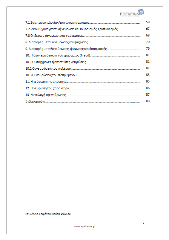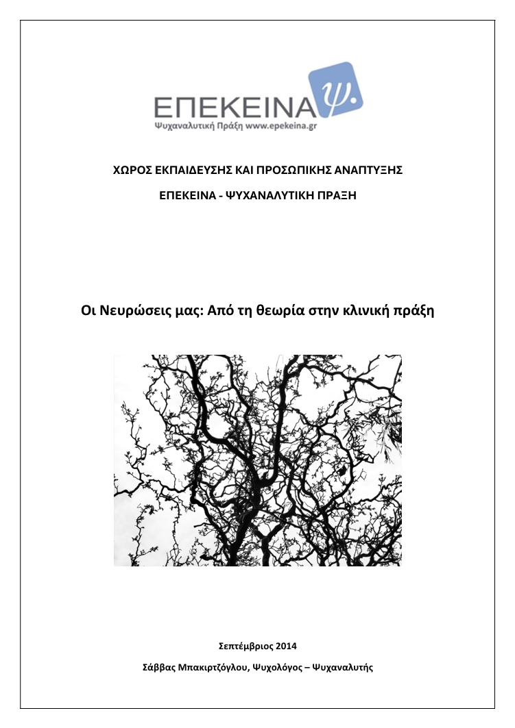 Η εκτεταμένη ανασκόπηση του παρόντος δοκιμίου περιλαμβάνει, πέραν των κλασικών νευρώσεων, και τη διερεύνηση-περιγραφή των ενεστωσών ή σύγχρονων νευρώσεων (αγχώδης νεύρωση, νευρασθένεια, υποχονδρία), οι οποίες εγκαθίστανται ως συνέπεια τραυματικών συμβάντων. Προκύπτει τότε ένα βίωμα κενού, έντασης, εκφόρτισης, διάχυτου άγχους, που εκφράζεται σωματικά με ταχυκαρδίες, εφιδρώσεις λιποθυμίες, ζάλη, τρέμουλα, δύσπνοιες.