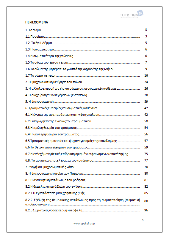 Το κείμενο πραγματεύεται τη σχέση ψυχής και σώματος μέσα από κλινικές-ψυχαναλυτικές προσεγγίσεις, επιπροσθέτως καλλιτεχνικές και φιλοσοφικές. Ξεκινώντας από τον κλασικό δυισμό σώματος-ψυχής (Σωκράτης, Καρτέσιος), παρουσιάζεται η σταδιακή μετάβαση προς τις μονιστικές θεωρίες οι οποίες τονίζουν την αλληλεπίδραση και την αδιαχώριστη ενότητα των δύο.
