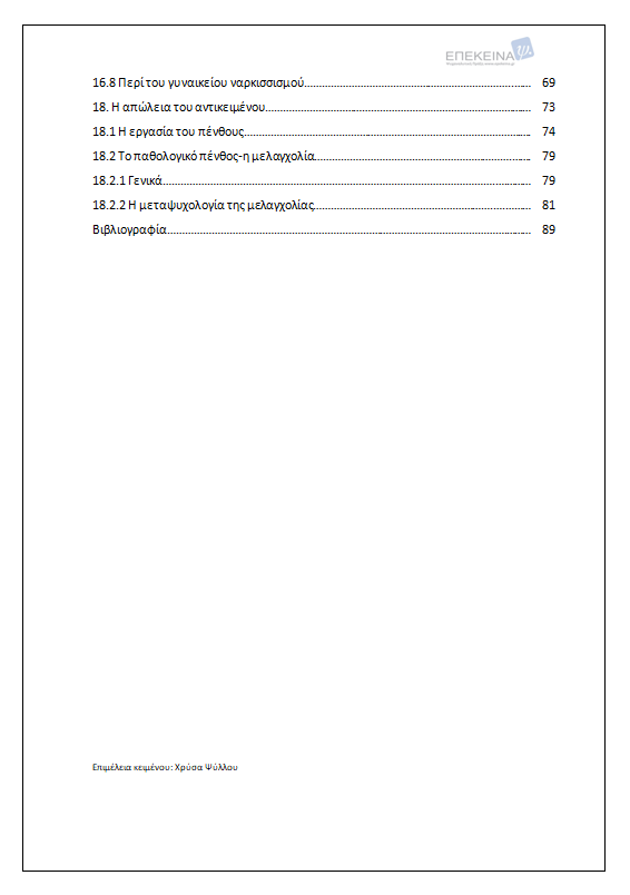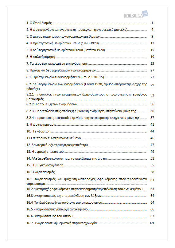 Το περιεχόμενο του εγχειρίδιου φιλοδοξεί να είναι ευχάριστο, φιλικό και χρήσιμο, όχι μόνο στον ειδικό των επιστημών της ψυχικής υγείας, αλλά και στον κάθε σκεπτόμενο άνθρωπο ο οποίος, ως ανήσυχος, διατυπώνει ερωτήματα αντί να εφησυχάζει. Θεματικές εγκατεστημένες πλέον στο συλλογικό μας ασυνείδητο, όπως αυτές της παλινδρόμησης, των ενορμήσεων της ζωής και του θανάτου, του φαινομένου του ναρκισσισμού, του πένθους κ.λπ., αποσυμπυκνώνονται έτσι ώστε να γίνονται κατανοητές και ενδεχομένως ελκυστικές, τόσο για τον φιλομαθή αναγνώστη, όσο και για τον κλινικό που αναζητά ψυχοθεραπευτικές και άλλες δεξιότητες στον πάγκο εργασίας του. Μια πληθώρα κλινικών παραδειγμάτων παρατίθενται εν είδει προστιθέμενης αξίας στο σύνολο της διατριβής.